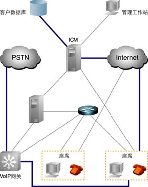 Cisco智能聯(lián)系管理軟件(ICM)可使企業(yè)通過(guò)Internet或PSTN并利用ACD、IVR、Web與電子郵件服務(wù)器、桌面應(yīng)用等與其客戶(hù)進(jìn)行交互;诰W(wǎng)絡(luò),ICM軟件可根據(jù)被叫號(hào)碼,主叫號(hào)碼,呼叫者輸入的數(shù)字,以Web形式提交的數(shù)據(jù),從客戶(hù)背景數(shù)據(jù)庫(kù)獲得的信息對(duì)每個(gè)客戶(hù)進(jìn)行區(qū)分。與此同時(shí),系統(tǒng)根據(jù)從聯(lián)絡(luò)中心平臺(tái)與座席桌面收集的實(shí)時(shí)狀態(tài)信息獲知哪些資源能夠用來(lái)滿(mǎn)足客戶(hù)的需求。具體的ICM系統(tǒng)組件如下。